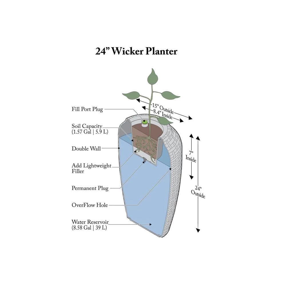 This elegant self watering planter provides a classic contemporary pot for your home and garden. Wicker texturing provides a natural rattan look to complement furniture on your patio and porch. Including a 10-years warranty, the Wicker self-watering planter is incredibly durable. This flower pot is resistant to cracking, fading and chipping, yet light enough to move. Equipped with an internal water reservoir, overflow drain and plug making watering simple.