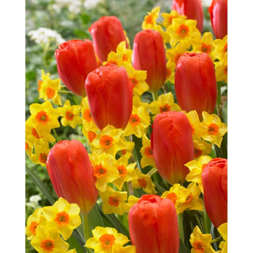 This Blend contains both Naricuss Martinette and Tulipa Appledorn. Perhaps 1 of the best fall planted bulbs for cutting, this mix includes the ‘Martinette’ Daffodil simply can’t be beat. Its beautiful clusters of delightfully fragrant, butter yellow blooms which bloom 3 to 6 per stem make them excellent in fresh floral arrangements. Not to mention that the frilled tangerine-orange cup in the center create a great accent in the garden as well. Darwin hybrid Appledorn Tulip breathtaking beauty is considered 1 of the best red long-stemmed tulips in gardens, also an excellent perennial. The signal red hue on its large, 5 in. flowers is make more dramatic by a touch of black at the base.