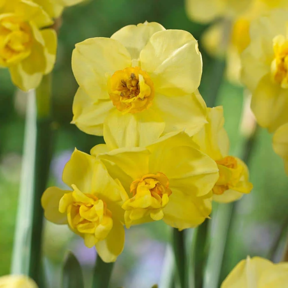 Everyone loves delightfully fragrant flowers. Yellow Cheerfulness Adds exuberance a delicate scent both in the garden and when added to cut flower arrangements. Flowers have ruffled yellow double petals with just a touch of orange in the center and lemony yellow outer petals. Each stem produces 2-4 showy blooms that last up to 4 weeks in the garden.