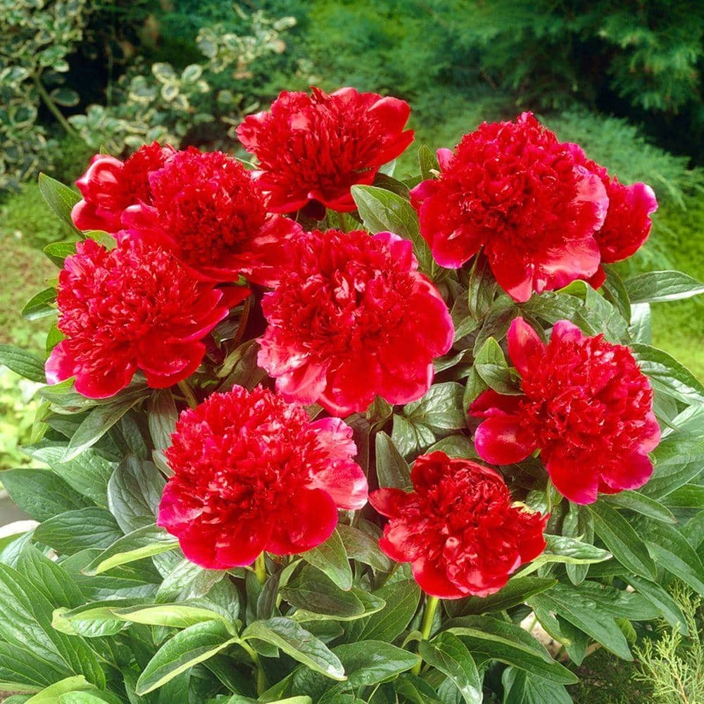 Easy to grow and delightfully fragrant, Peonies are the classics all gardeners desire. Thriving in full sun to light shade, huge double blooms sit atop sturdy erect stems. Showy deep red petals are ruffled along the edges and foliage remains attractive throughout the summer and into fall. Use in borders or along fences, sidewalks, driveways and walls; these charmers will bring compliments galore and attract butterflies, too.