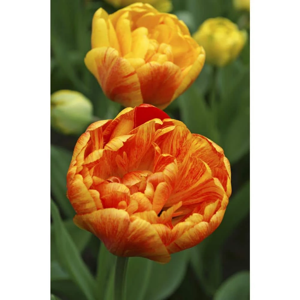 Sunlover Double Late Tulip boasts sunny blooms that warm the late spring garden in vivid shades of golden yellow and tangerine orange. Petals are lined with red and dark amber streaks and are densely layered so that the flowers take on a peony-like appearance. We truly look forward to seeing those blue-green leaves start to emerge as the Earth awakens from its winter sleep.