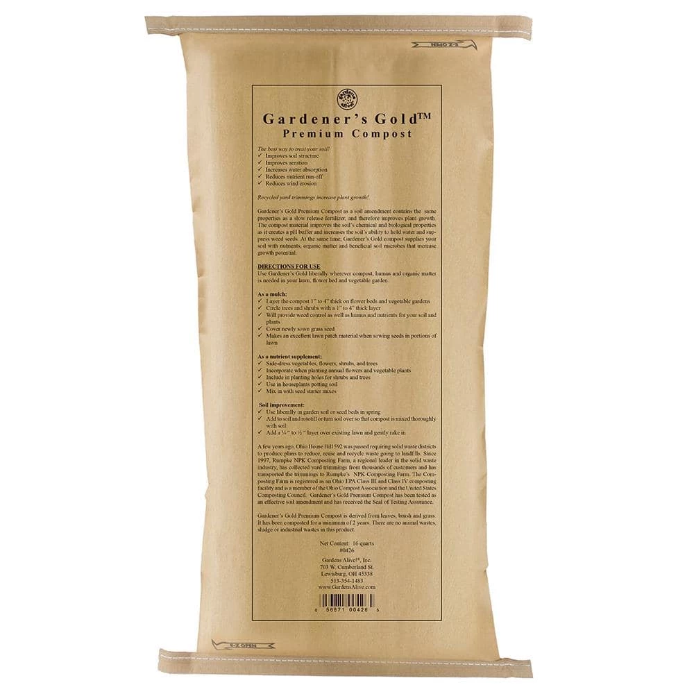 Gardeners Gold Premium Compost is made from matter you can trust leaves, brush and grass that have decomposed for a minimum of 2-years. It contains no animal manures, sludge or industrial wastes that other bagged composts may contain. Gardener’s Gold improves the soils chemical and biological properties, creating a pH buffer and increasing the soils ability to hold water and suppress weed seeds. At the same time, it supplies your soil with nutrients, organic matter and beneficial soil microbes that increase the growth potential of your plants. You can use Gardeners Gold wherever you need compost: on your lawn or in your flower beds and vegetable gardens. The amount you need and the way you apply it depends on your purpose and the size of the area where you want to use it.