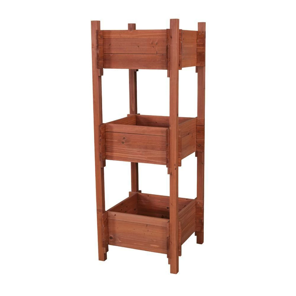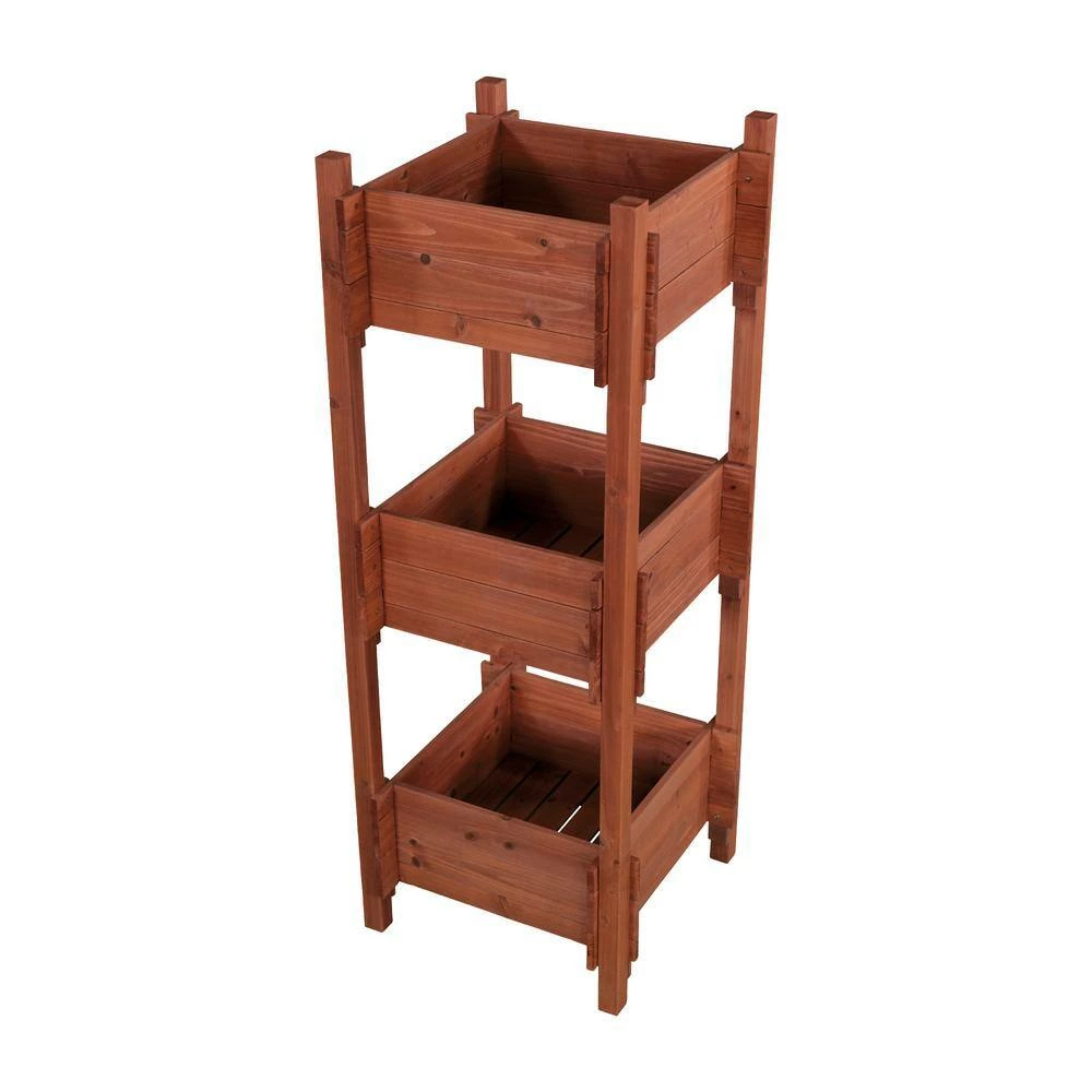 3-tier solid wood planter box for vegetables, herbs or blooms. Stack ’em up and say so long to plants here and there. Our space-saving, 3-tier planter box gives you a generous planting area and a single-area display. Outdoor ready and indoor worthy to perfectly adorn a corner, porch or balcony. Rustic and with the right amount of strength to hold various sized plants, including deep-rooted vegetables. Medium brown accentuates furnishings you already have. Crafted of solid wood harvested from the Cypress tree family with decay resistance similar to Western Red Cedar.