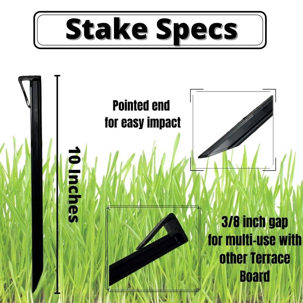 These 10 stakes snap on top of the Terrace Board for easy installation and provides exceptional holding power. Color coordinated stakes provide an attractive seamless look. Staking is recommended every 4. More stakes may be needed for additional curves or unstable ground.