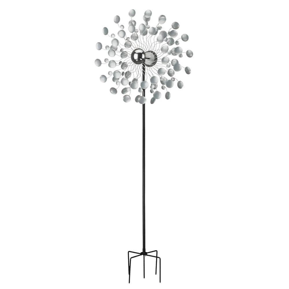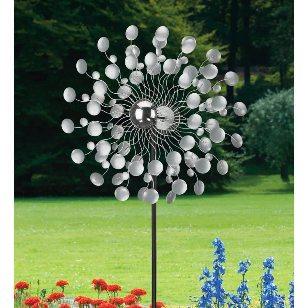 A total of 96 silver discs on wavy wire, 48 on each side, spin in opposite directions with a mirrored stainless steel reflective dome in the center makes this gazing Wind Spinner a spectacle to watch as it spins. Made of sturdy metal and strong poles and stakes that can withstand the wind. This is a classic addition for your yard.