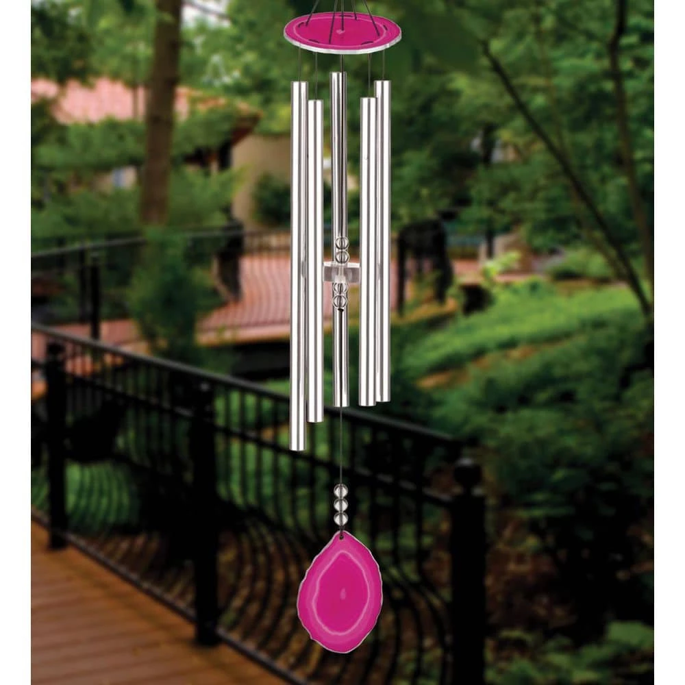 Brightly colored matching quartz pieces form the top and sail of this remarkable design. The central cord holds a clear acrylic clapper and decorative beads. Precision-tuned thick aluminum chime tubes deliver a premium sound experience and sustained ring. Available in 4 colors – Amber, Blue, Pink and Purple.