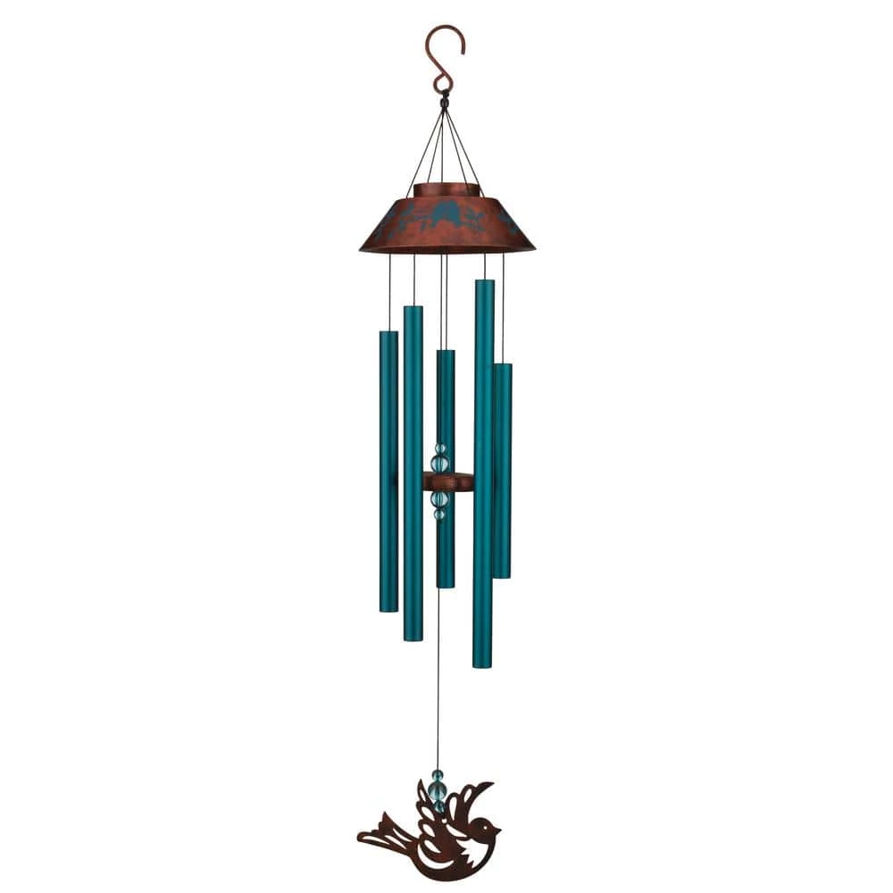 A rustic copper top, clapper and sail combine with turquoise tubes to make a rich combination of colors. The laser cut bird sail is ornamented with blue acrylic beads, and when it moves the clapper in the wind creates the ‘3 Little Birds’ song in the chimes. The decorative topper has stenciled blue birds on a branch that sets beautifully against the rustic copper color. A great sound and masterpiece of design. Available in 2 sizes – 32″ & 40″.