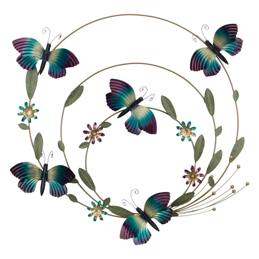 - Made of metal with a powder-coat finish, this openwork circular wreath features colorful butterflies, leaves and flowers