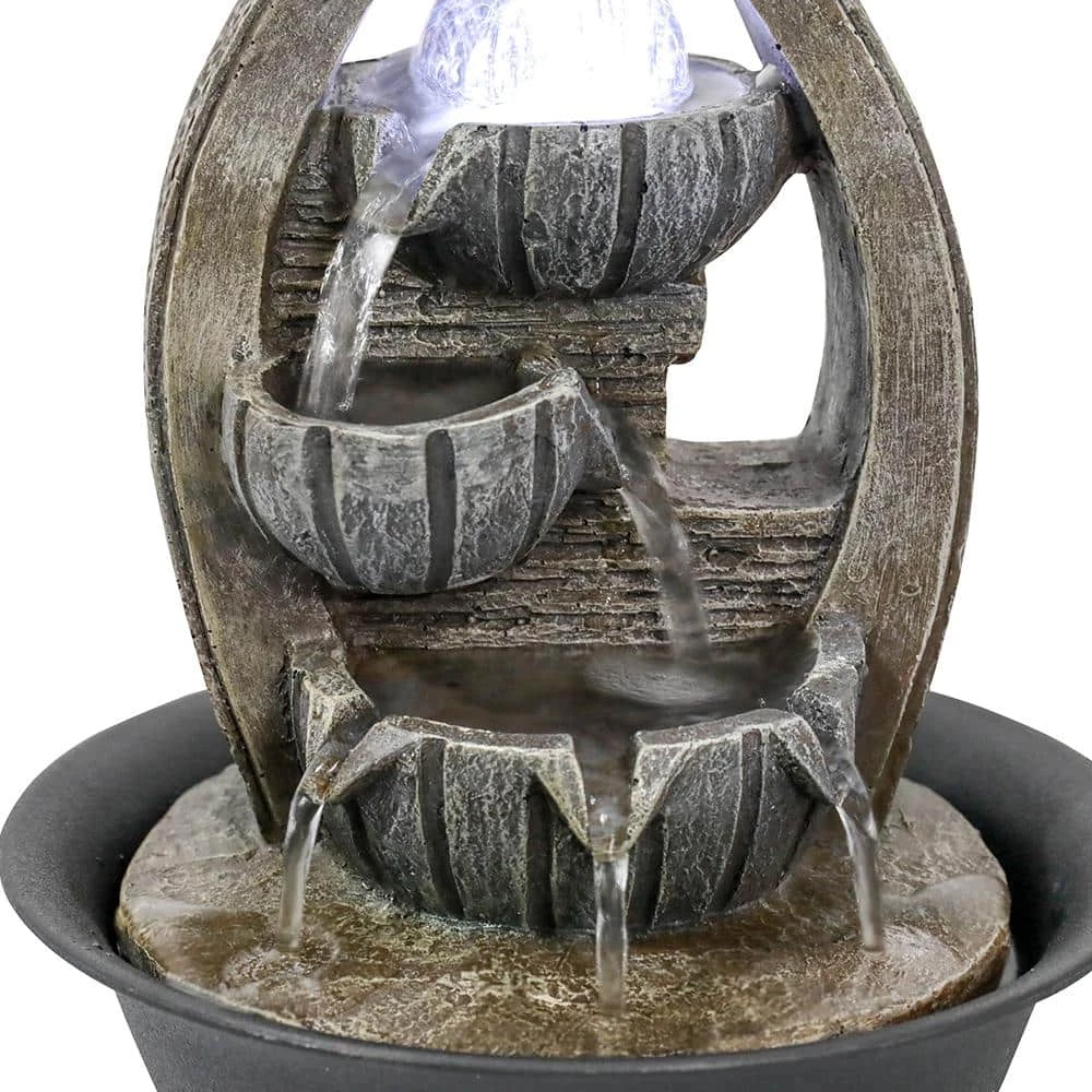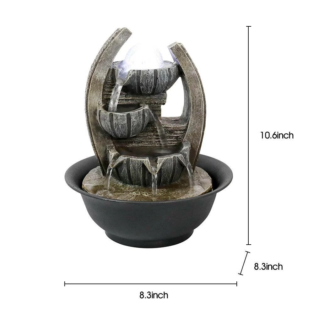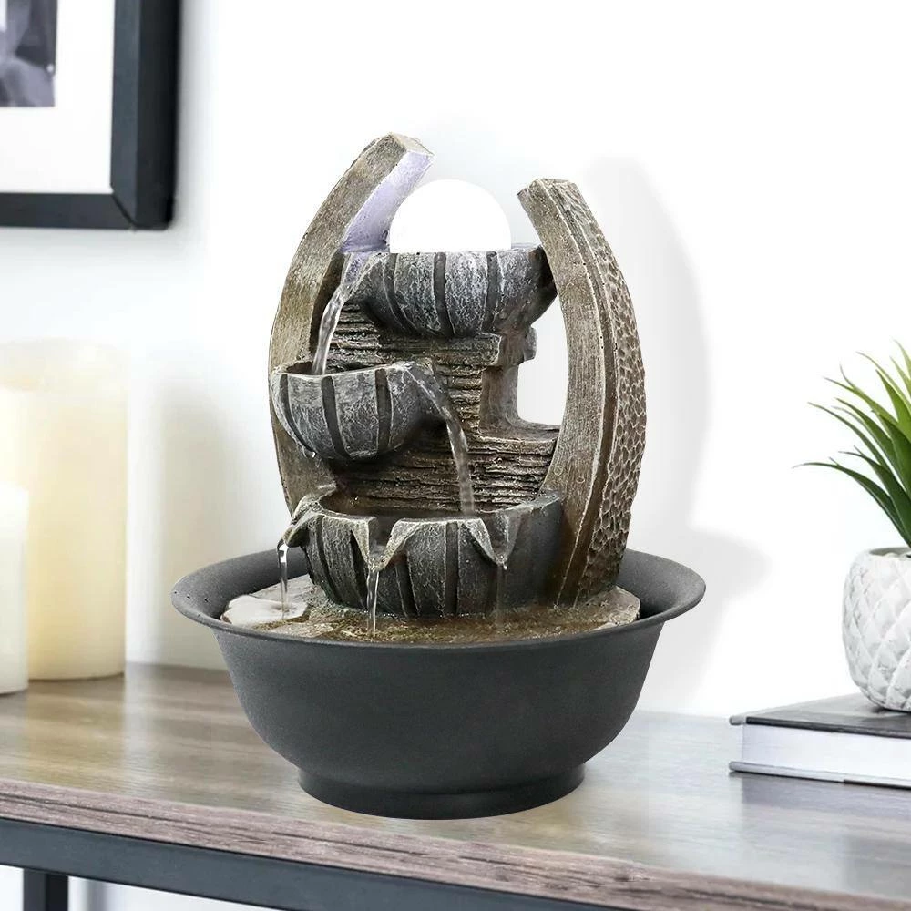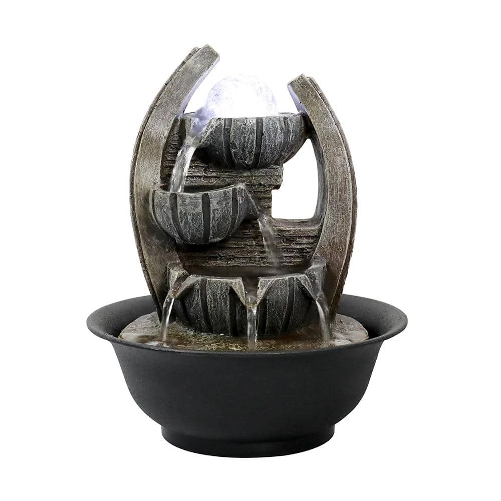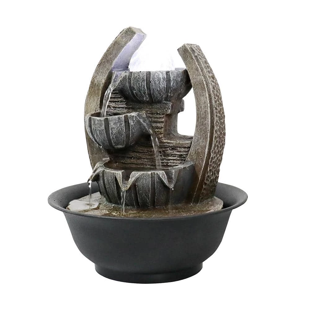 - De-stressing and relaxing: the cascading LED lighted fountain was designed with 3-texture bowls tiered in 3-layers and embedded in a modern arch, water trickles from the top bowl to the 2 bowl and branches in 3 flows running from the third bowl to the round basin circularly, to rotate the crystal ball and creates soothing, gurgling natural waterfall flow sounds, LED lights illuminates the spinning orbs, the flower waterfall and the whole zen fountain, transfers your place into an oasis full of life and vitality