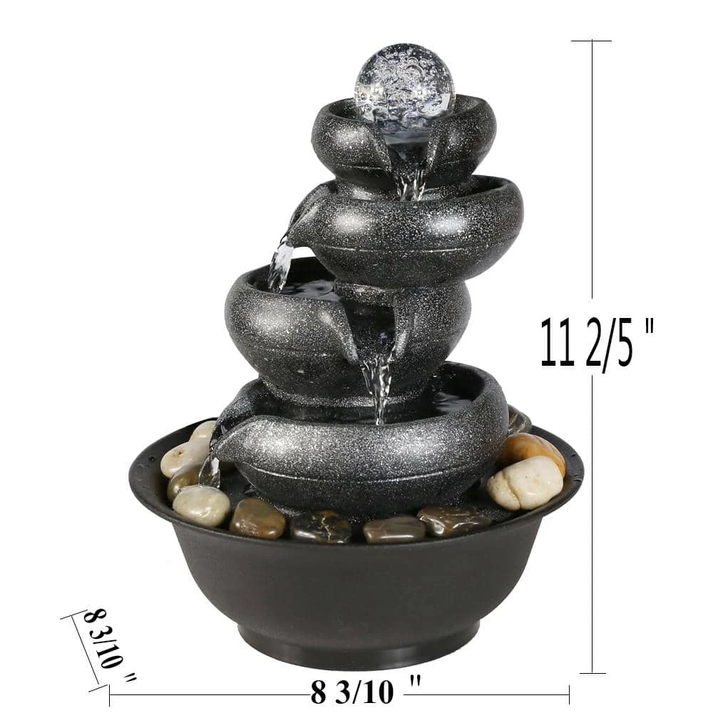 - Indoor tabletop fountain was made from sturdy and lightweight resin with perfect dimensions 8.27 in. L x 8.27 in. W x 11.42 in. H (L x W x H) it’s very cute and idea to be placed on a desktop, coffee table, writing desk, etc.