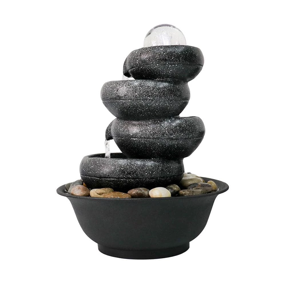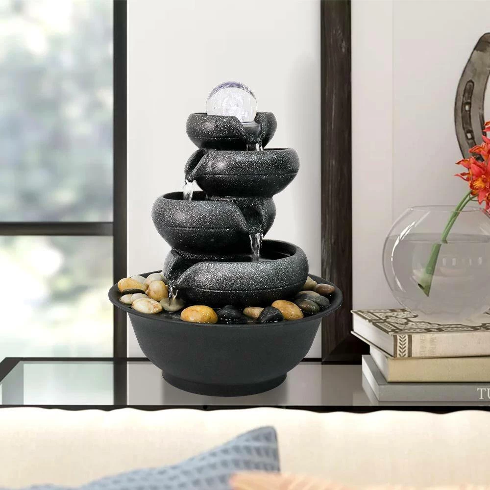 Relax and enjoy the sounds of nature with this indoor waterfall fountain. With the high-quality resin fountain, you will create a meditative, relaxing atmosphere, even in an urban jungle. The tabletop fountain looks great in your house and office places, such as meeting room, coffee room, living room, book room, yoga room, meditation room, dinning room, bedroom, kitchen, etc. Take in the tranquil sounds of the water gently cascading over the natural-looking fountain tiers. The resin, stone powder construction are weatherproof, rust-resistant and durable for years of quality use. When start using, simply plug into an outdoor outlet, fill the basement with enough water and watch as the interior pump creates a lovely water flow reminiscent of a lush rainforest. LED lights embedded in the tiers will illuminate your space, drawing attention to the relaxing waterfall day or night for added ambiance.