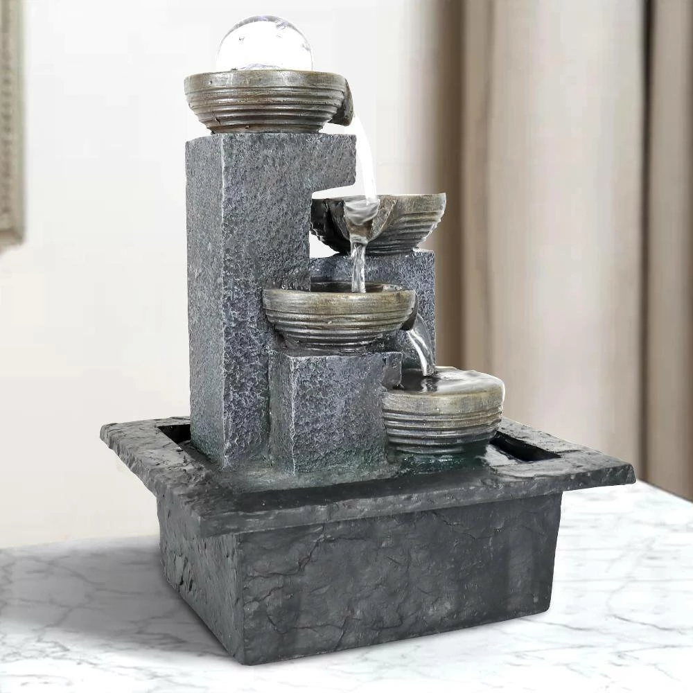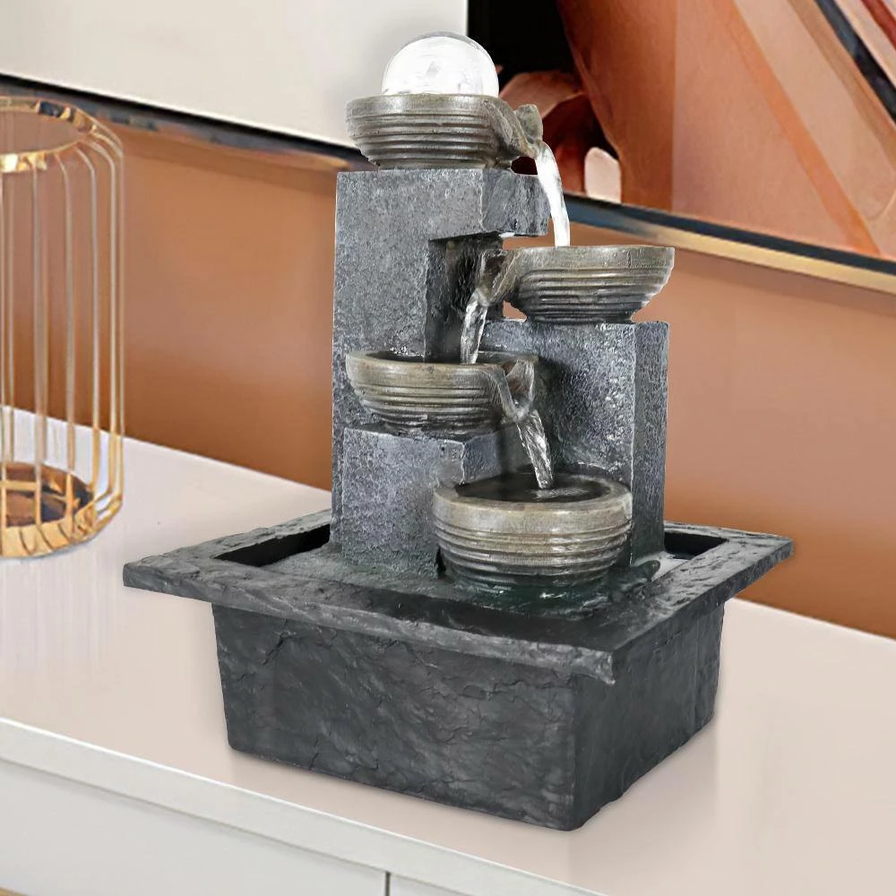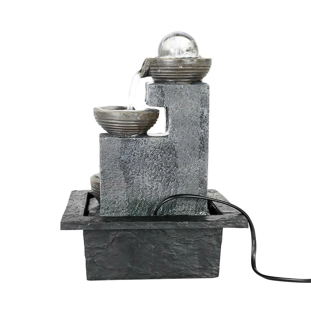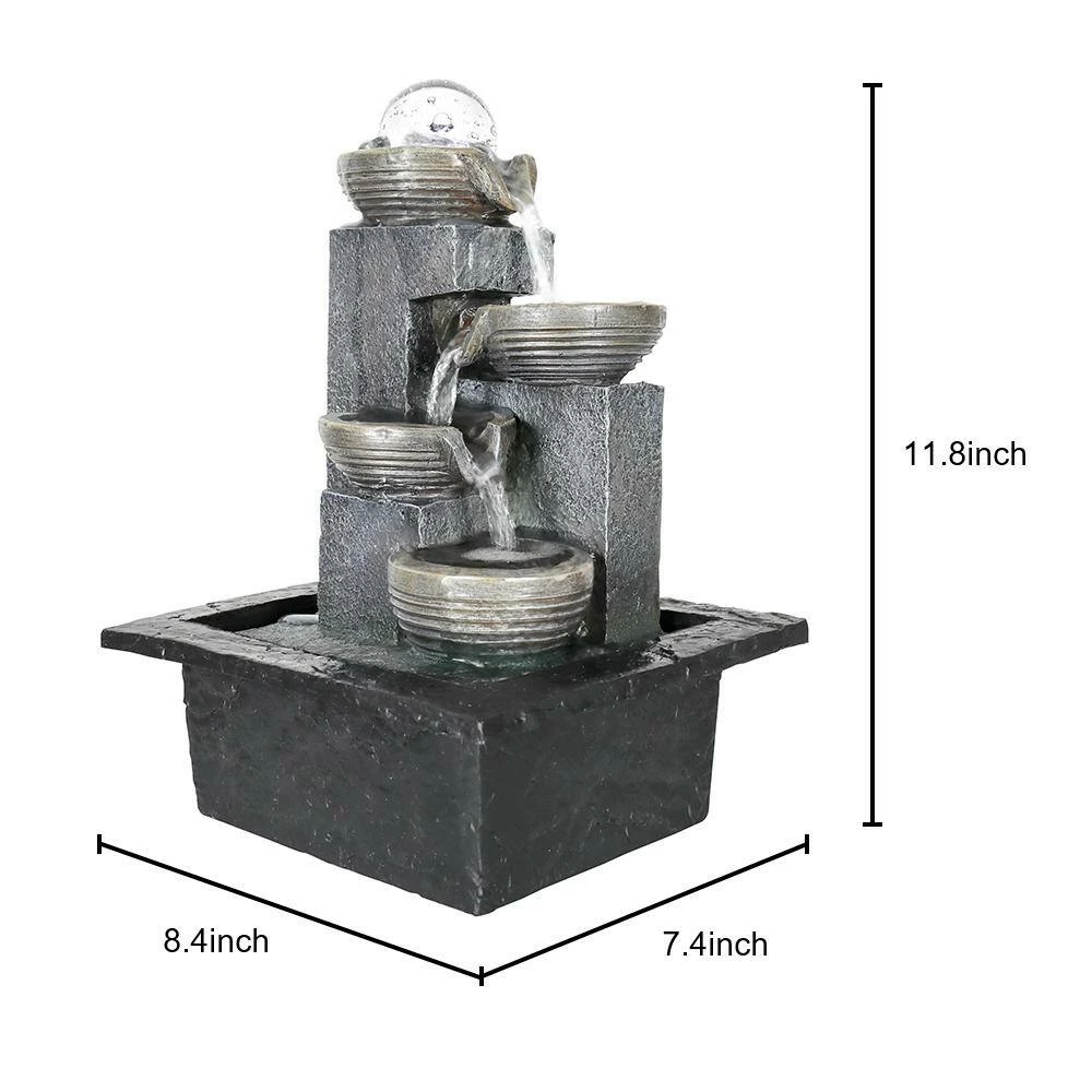 Relax and enjoy the sounds of nature with this indoor waterfall fountain. with the high-quality resin fountain, you will create a meditative, relaxing atmosphere, even in an urban jungle. The tabletop fountain looks great in your house and office places, such as meeting room, coffee room, living room, book room, yoga room, meditation room, dinning room, bedroom, kitchen, etc. Take in the tranquil sounds of the water gently cascading over the natural-looking fountain tiers. The resin, stone powder construction are weatherproof, rust-resistant and durable for years of quality use. When start using, simply plug into an outdoor outlet, fill the basement with enough water and watch as the interior pump creates a lovely water flow reminiscent of a lush rainforest. LED lights embedded in the tiers will illuminate your space, drawing attention to the relaxing waterfall day or night for added ambiance.
