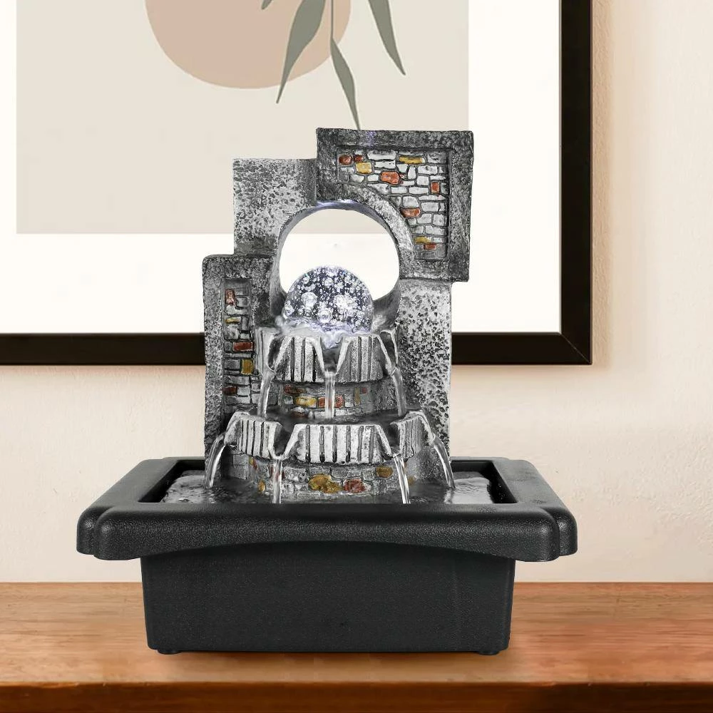 - Transparent ball on the top, when the desktop electric water fountain starts to work, the running water will drive the crystal ball to rotate, the LED lights will illuminate the water flow and ball, creates the most beautiful scenery in a room