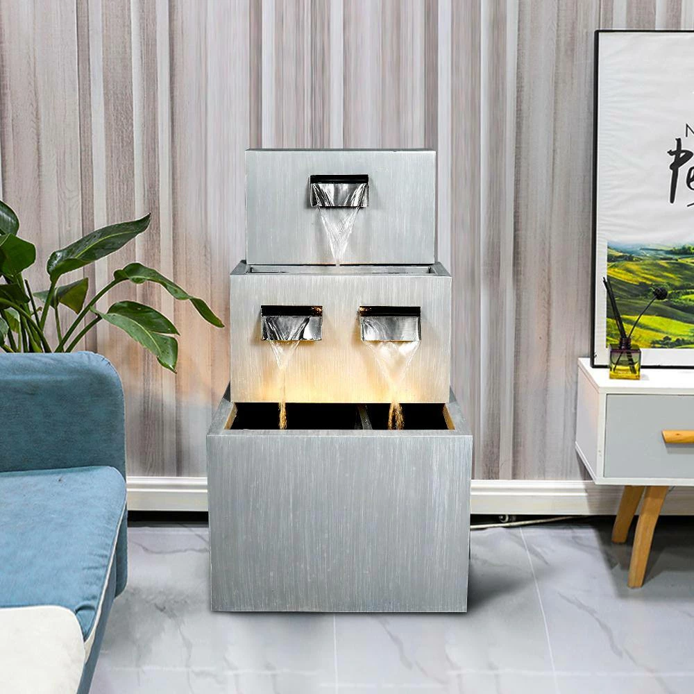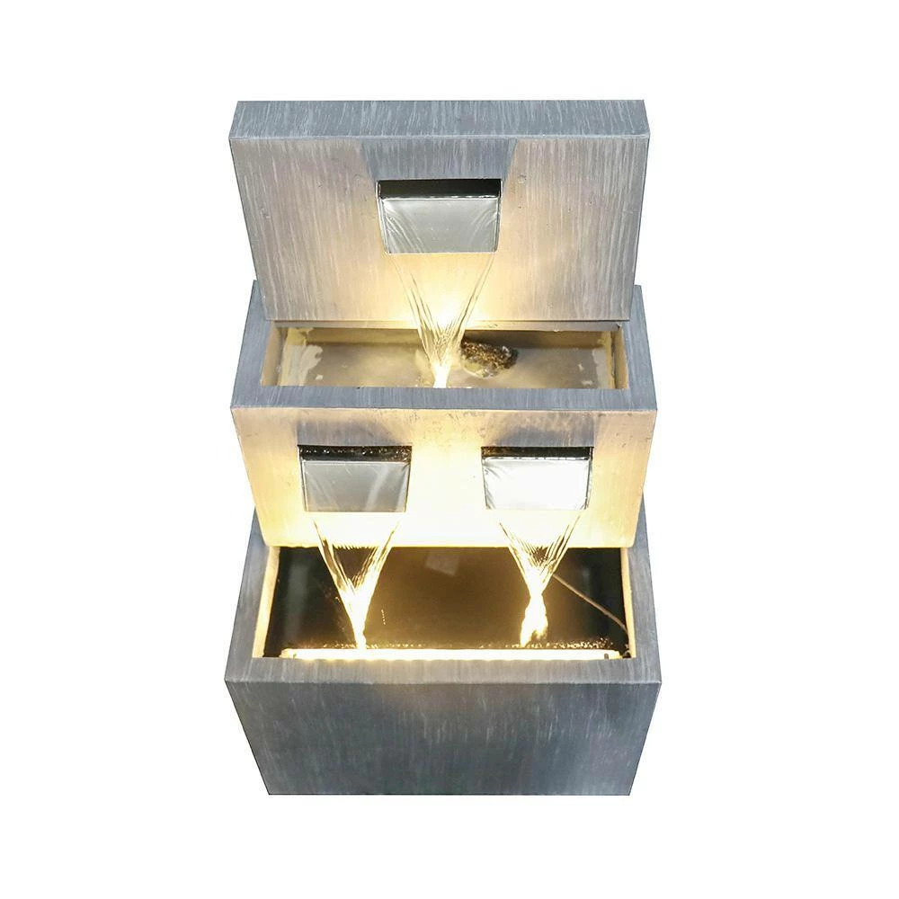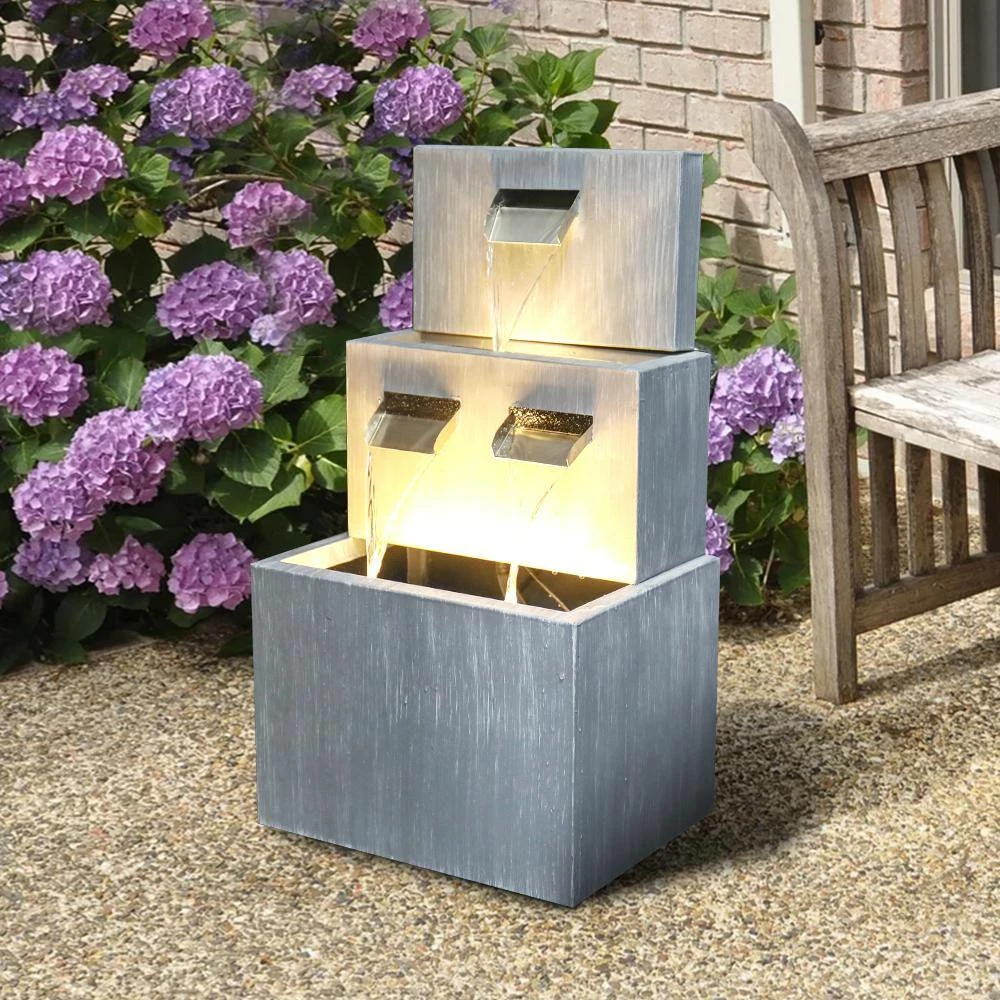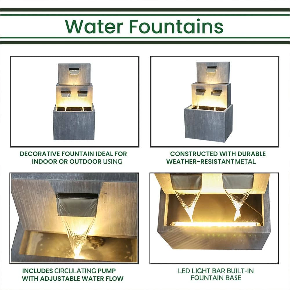 Relax and enjoy the sounds of nature with this outdoor waterfall fountain. With the high-quality metal fountain, you will create a meditative, relaxing atmosphere, even in an urban jungle. The waterfall feature looks great in your garden, patio, deck, porch or yard space, etc. Take in the tranquil sounds of the water gently cascading over the natural-looking fountain tiers. The metal construction are weatherproof, rust-resistant and durable for years of quality use. When start using, simply plug into an outdoor outlet, fill the lower level with enough water and watch as the interior pump creates a lovely water flow reminiscent of a lush rainforest. LED lights embedded in the tiers will illuminate your space, drawing attention to the relaxing water pools day or night for added ambiance.