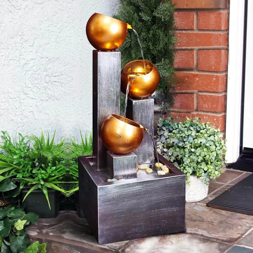 - Durable ideal outdoor metal fountain: metal construction is rust and weather-resistant for long-lasting beauty, strength, and stability, make the metal garden fountain look new over time. 3 brass color metal bowls on 3 brown square pillars, looks like 3 glittering flowers blooming in a square metal flowerpot covered with pebbles, no matter indoor or outdoor, garden, patio, house or office, the modern industrial metal waterfall fountain will add style to any space with its elegant presence