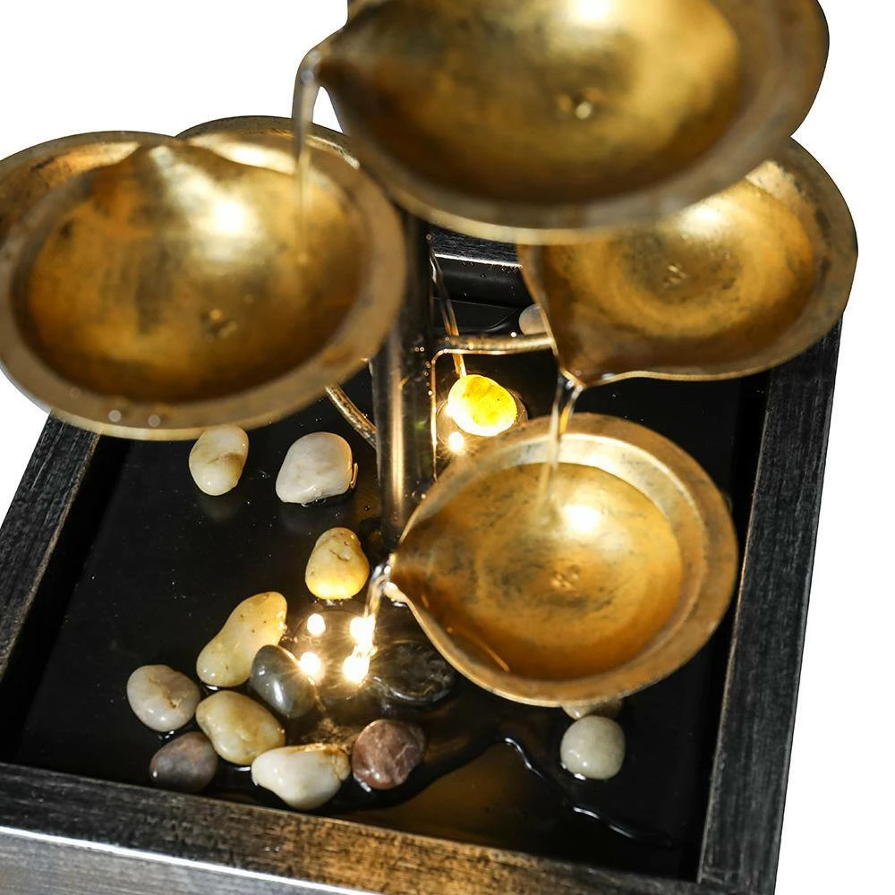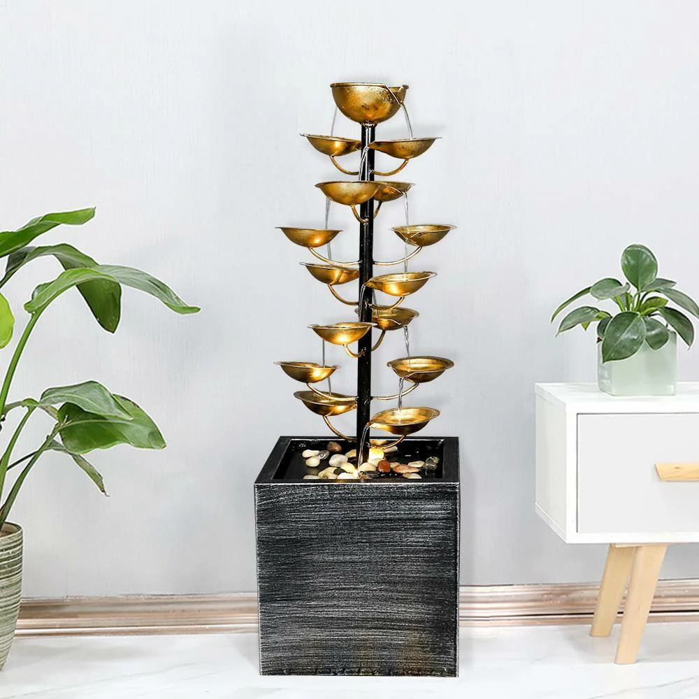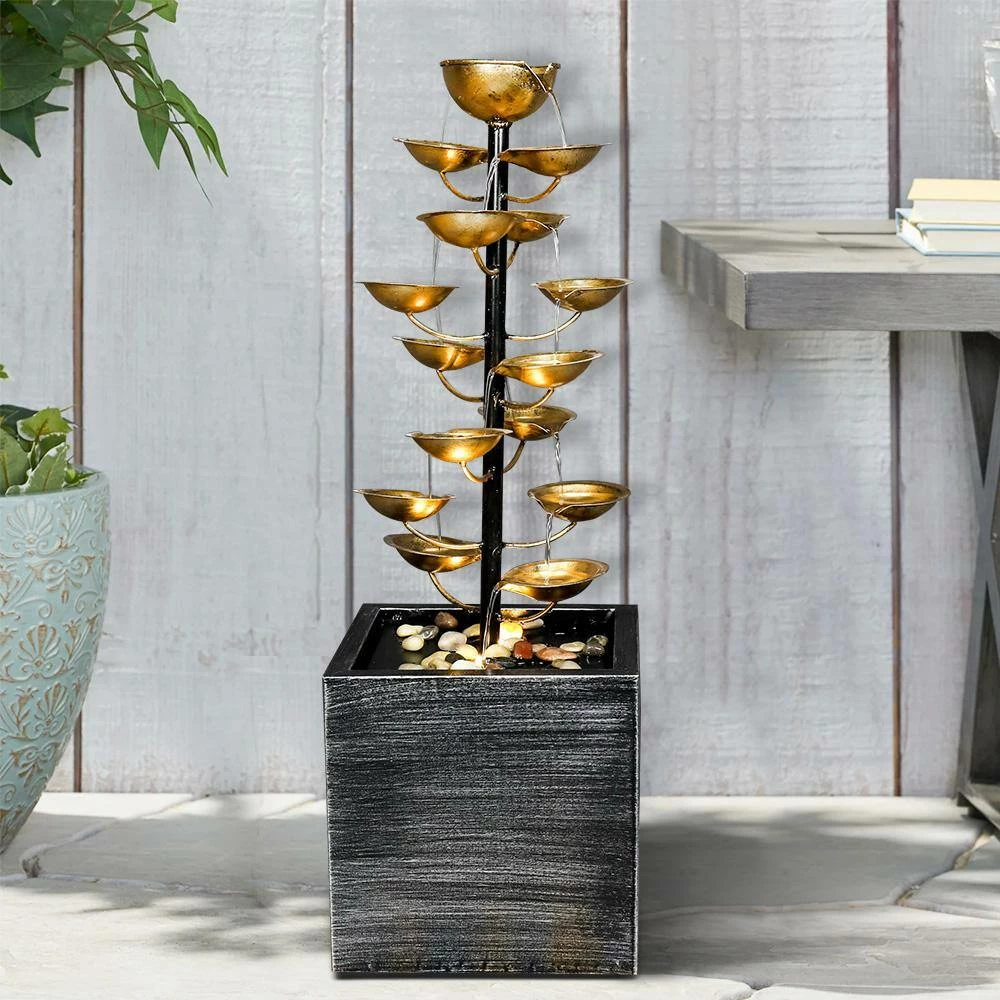 - Rustic multi-tier metal waterfall fountain has the most ideal dimension: 31.1 in. H x 10.6 in. L x 10.6 in. W, suitable for decor indoor and outdoor of your living or working place and will help to bring natural beauty to the surroundings, the multi-tiered gold lotus outdoor flower design, circularly running water and soft LED lighting sets impressive accents for your garden, terrace, deck, patio, porch, backyard or any place of your living or working place