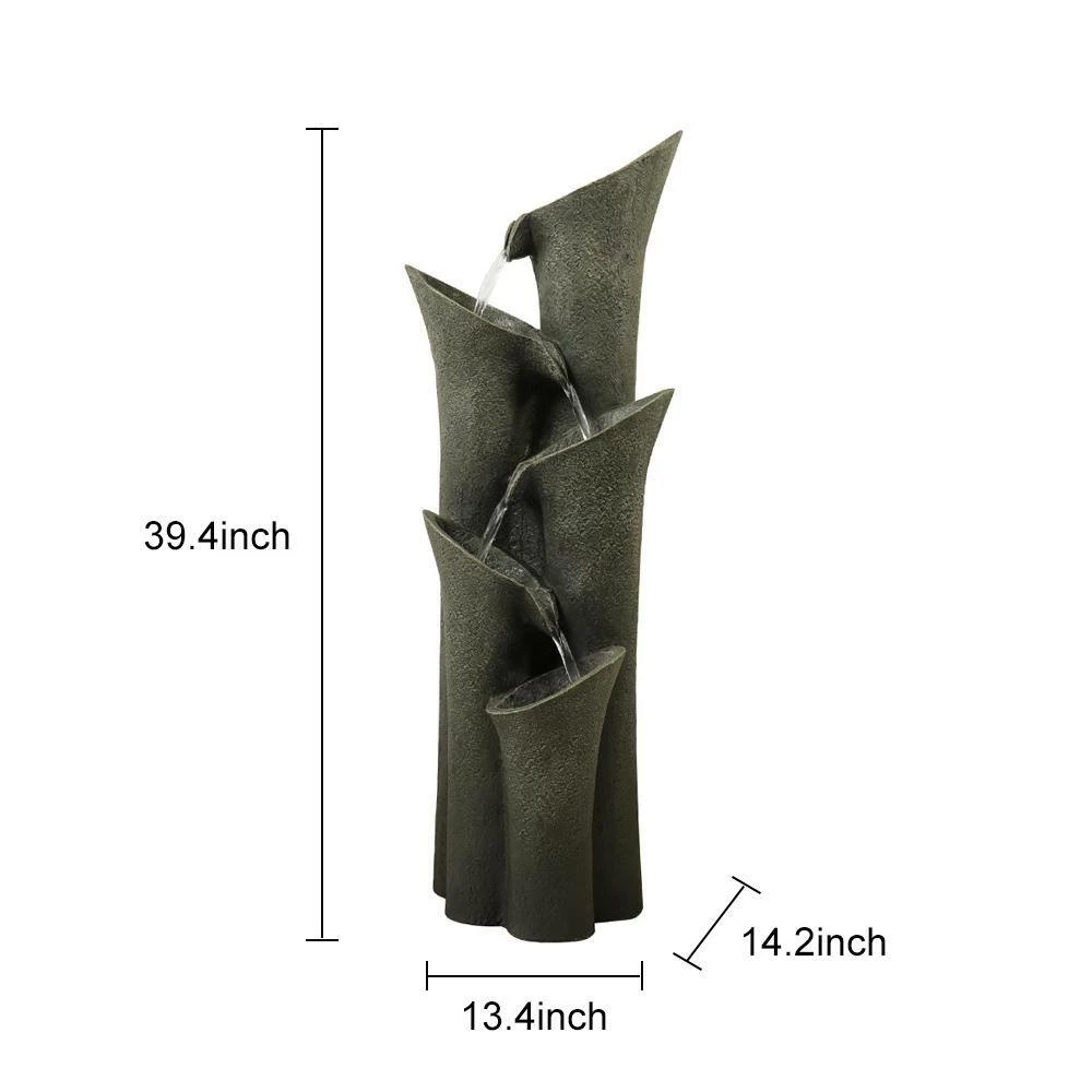 - Indoor Outdoor Fountain: 39 1/2 in. H x 14 1/5 in. W x 13 2/5 in. L garden fountain is the perfect addition for indoor outdoor decor, made from polyresin with fiberglass, constructs the outdoor water fountain is durable and weatH erproof to keep looking new over time