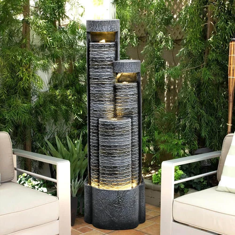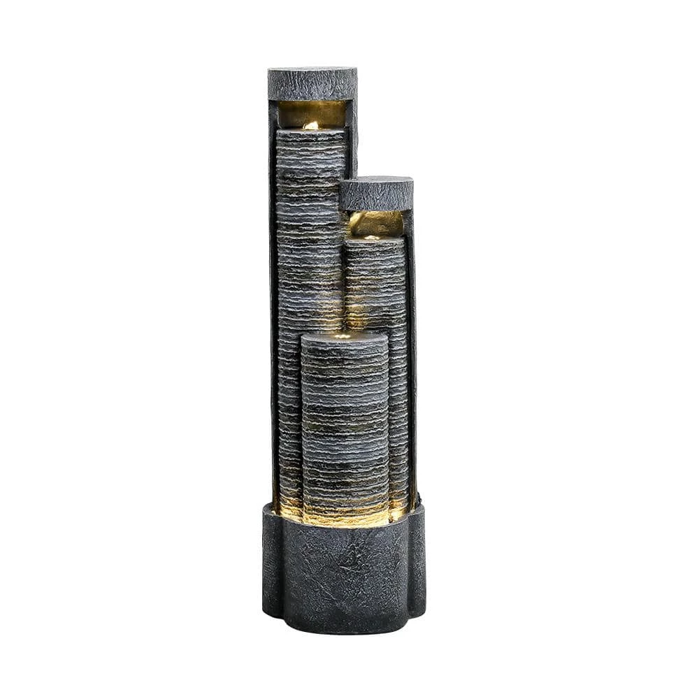 - 3-columnar geometric fountain: The modern cylinder water fountain was comprised of 3-columns with LED lights and a round illuminated basin, forming a contemporary work of art, the whole LED fountain was finished with mysterious dark gray color to create an elegantly contemporary accent in your indoor outdoor area, the all-match color, cascading tiered freestanding columns and water wave lines will contrast with the vibrant greenery in your flowerbeds and landscaping or with your modern indoor house decor.