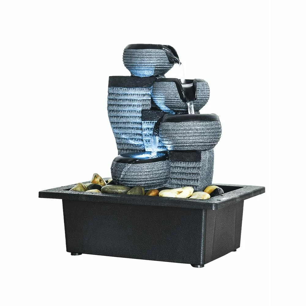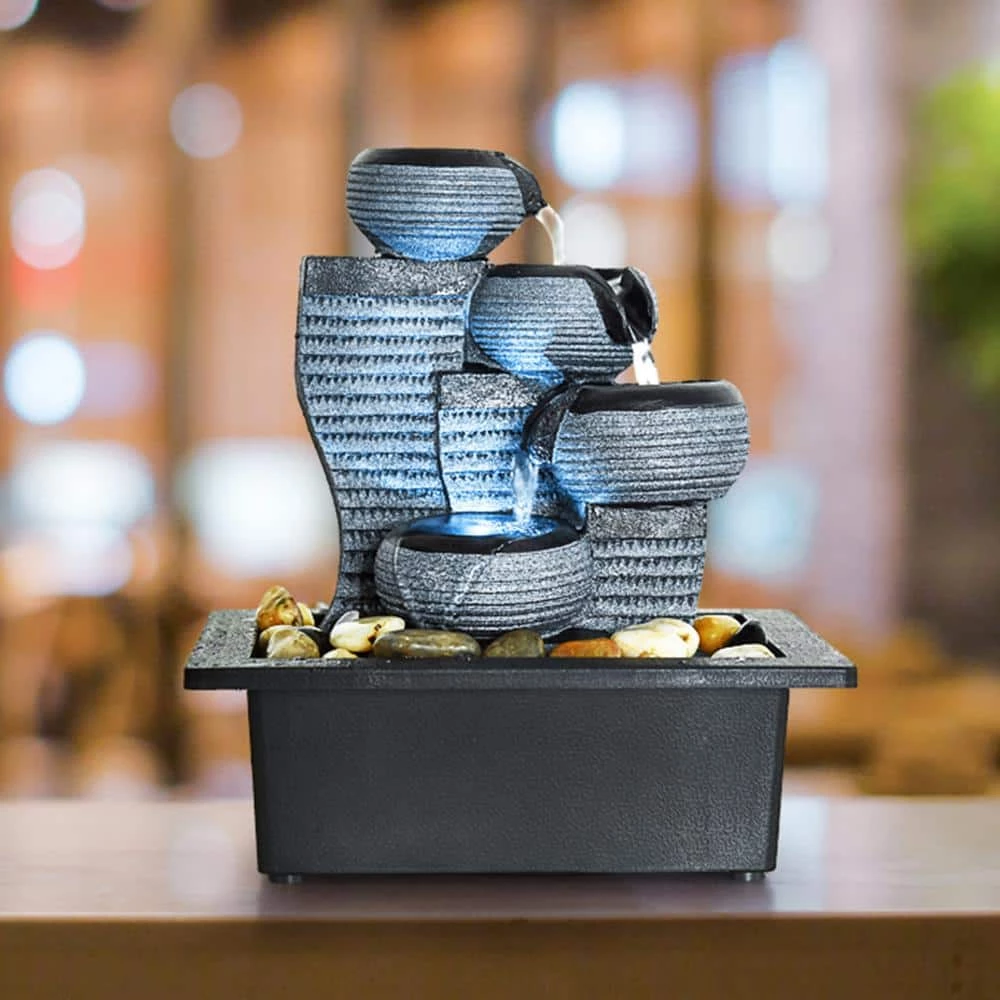 - Water flows down four levels, built-in LED accent light illuminate the streams, enjoy the reflective glow of fresh running water from the zen fountain