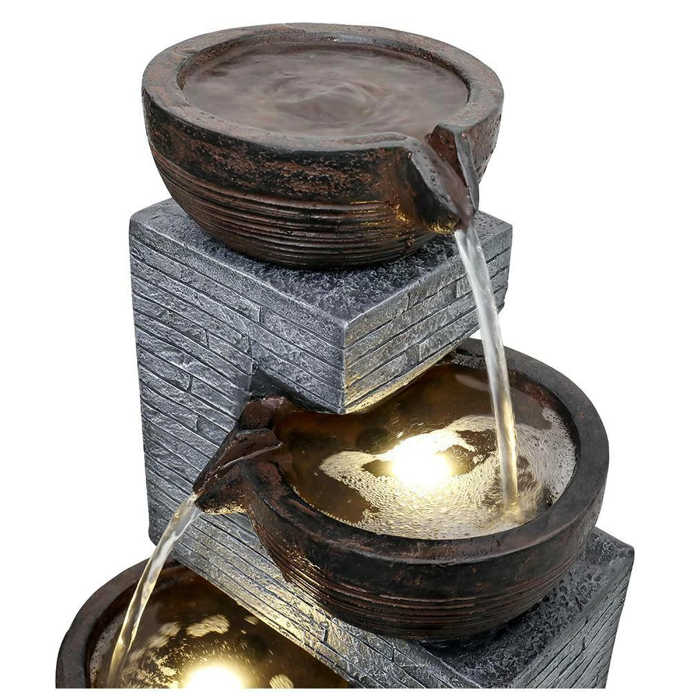 Relax and enjoy the sounds of nature with this outdoor waterfall fountain. With the high-quality resin fountain, you will create a meditative, relaxing atmosphere, even in an urban jungle. The waterfall feature looks great in your garden, patio, deck, porch, or yard space, etc. Take in the tranquil sounds of the water gently cascading over the natural-looking fountain tiers. The resin, stone powder, and fiberglass construction are weatherproof, rust-resistant, and durable for-years of quality use. When start using, simply plug into an outdoor outlet, fill the lower level with enough water, and watch as the interior pump creates a lovely water flow reminiscent of a lush rainforest. LED lights embedded in the tiers will illuminate your space, drawing attention to the relaxing water pools-day or night for added ambiance.