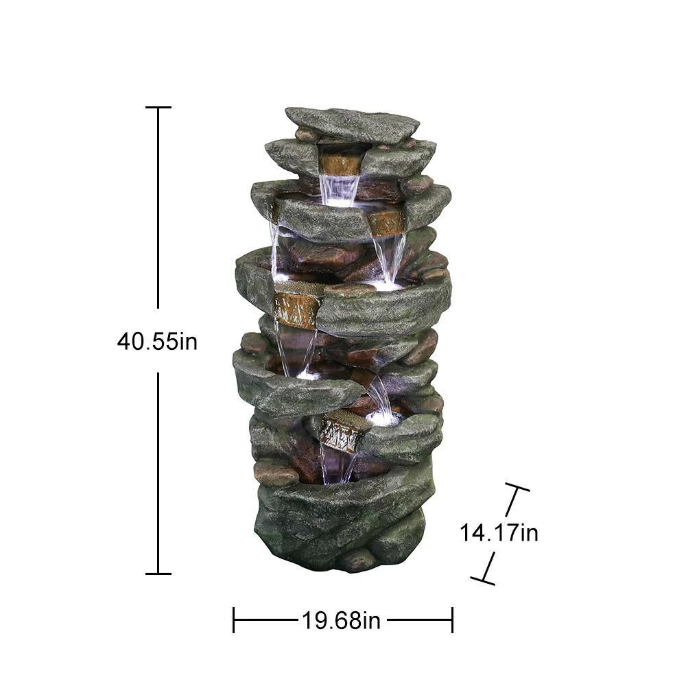 - Perfect indoor outdoor decor-suitable size (L*W*G):19.7 in. L x 14.2 in. W x 40.6 in. G, rock-stacking structure, charming natural water running sounds, fantastic 6 LEDs lighted cascading waterfalls, this LED rockery fountain will create a peaceful and harmonious atmosphere to house, company, garden, patio, yard, lawn, etc.