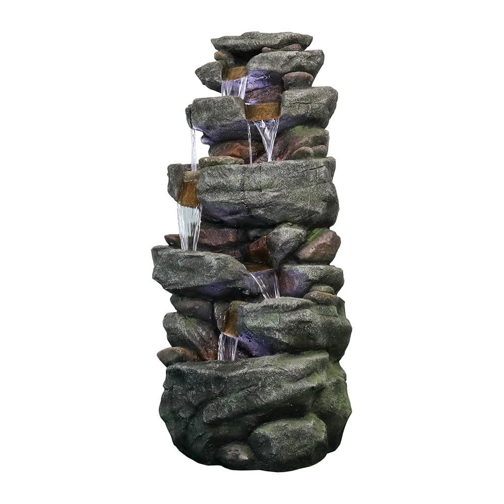 Relax and enjoy the sounds of nature with this outdoor waterfall fountain. With the high-quality resin fountain, you will create a meditative, relaxing atmosphere, even in an urban jungle. The waterfall feature looks great in your garden, patio, deck, porch, or yard space, etc. Take in the tranquil sounds of the water gently cascading over the natural-looking fountain tiers. The resin, stone powder, and fiberglass construction are weatherproof, rust-resistant, and durable for years of quality use. When start using, simply plug into an outdoor outlet, fill the lower level with enough water, and watch as the interior pump creates a lovely water flow reminiscent of a lush rainforest. LED lights embedded in the tiers will illuminate your space, drawing attention to the relaxing water pools day or night for added ambiance.