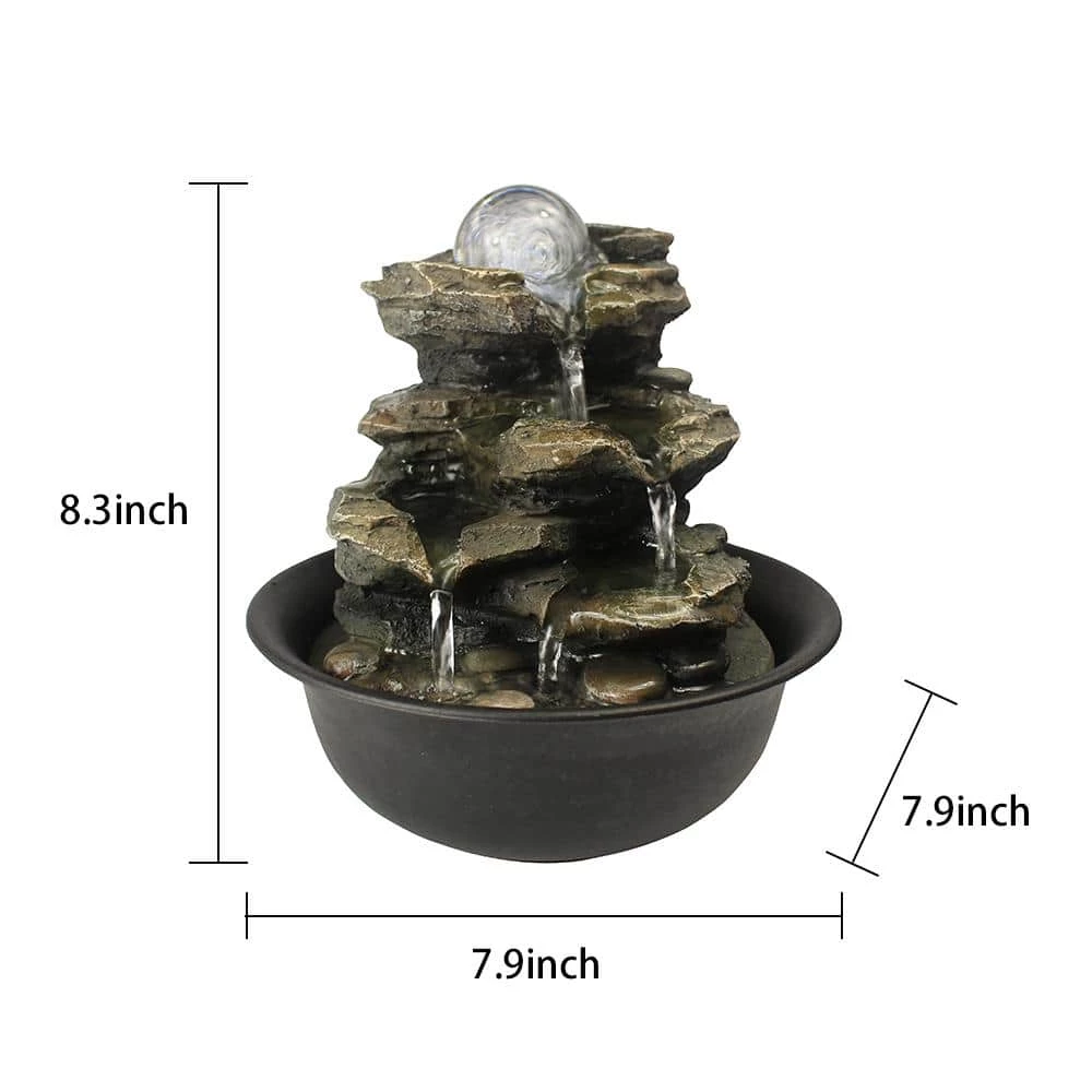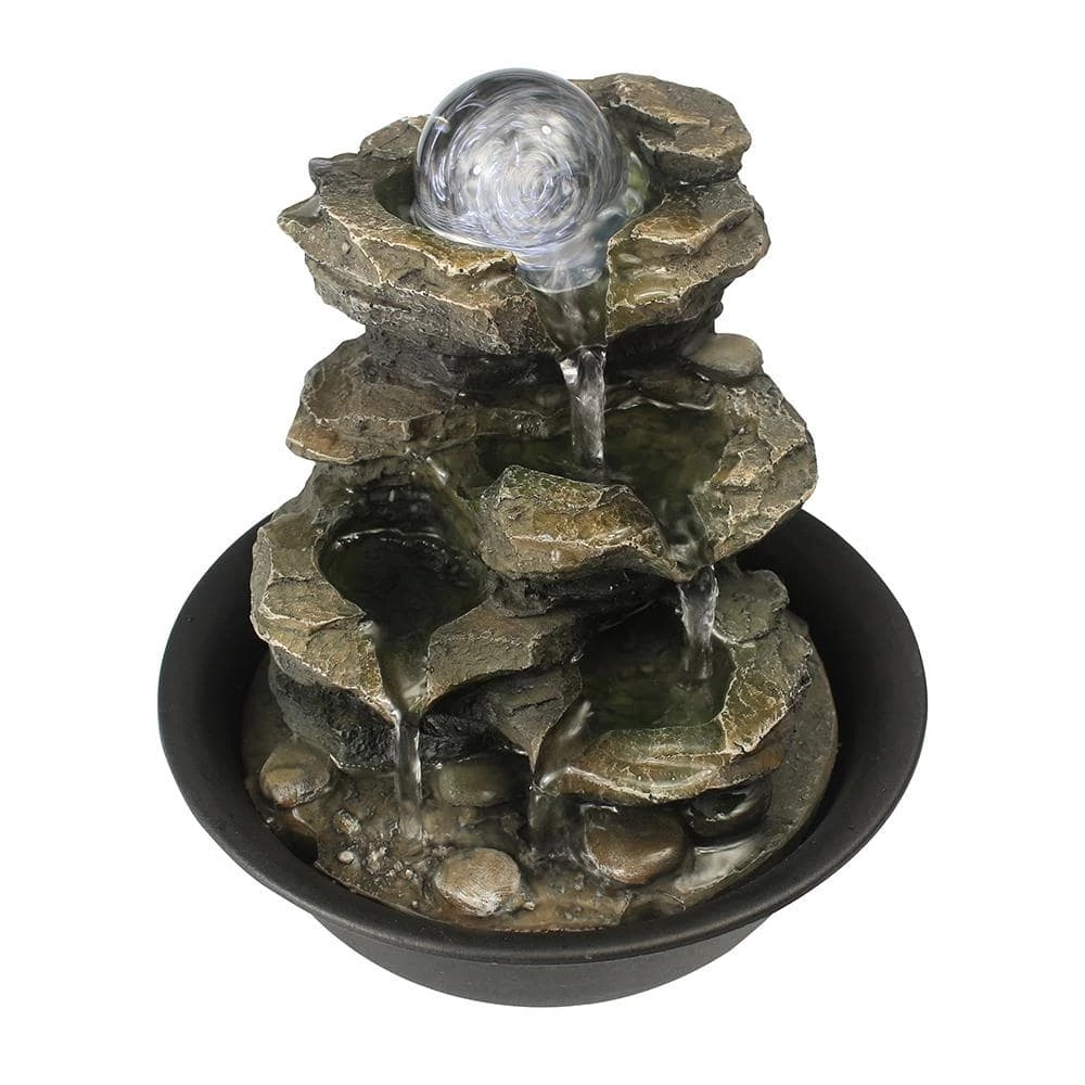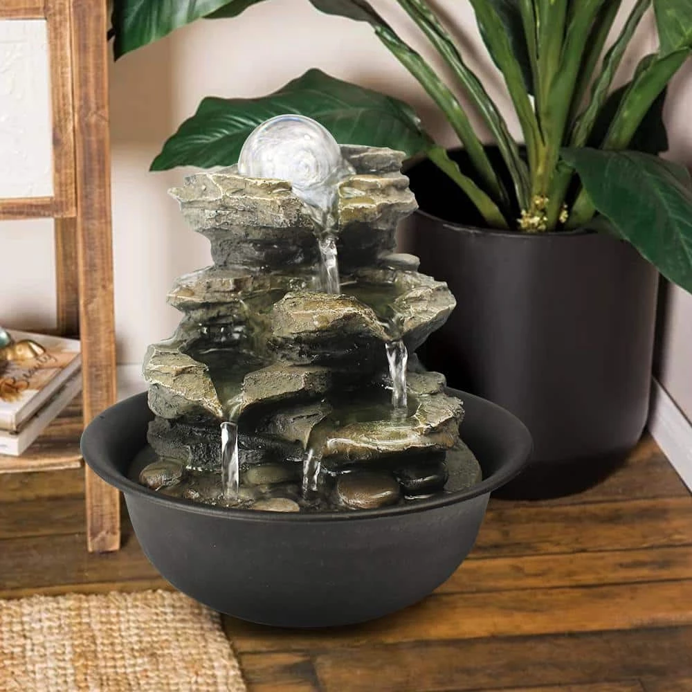 - Design-4-tiered rockery cascading water fountain was designed with moss on each tier to imitate real outdoor rockery elements, provides it a wonderful natural appeal, rustic and elegant, illuminated water trickles from the top to the bottom circularly to mimic the sounds of a real waterfall, spins the crystal-like ball on the top, offers soothing, tranquil and meditative water flow sounds for a calming ambiance, helps to achieve healthier air humidity levels all around you